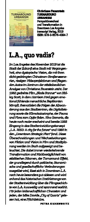 Die aktuelle Publikation Turnaround Urbanism. Perspektivwechsel und Transformation in Downtown Los Angeles untersucht die aktuellen Transformationsprozesse aus der historischen Perspektive der Stadtentwicklung. Los Angeles, November 2019 steht am Beginn des für seine dystopische Zukunftsvision bekannten Films Blade Runner, in dem überfüllte Straßen und verfallende Fassaden im Kontrast zu futuristischen Videoprojektionen stehen. Die im Jahr 1982 imaginierte Zukunft von L.A. ist heute real erfahrbare Gegenwart – Anlass sich mit der städtischen Entwicklung des Drehorts, der Downtown von Los Angeles, zu beschäftigen. In Blade Runner ist die Stadt der Zukunft eine Stadt mit Vergangenheit. Der Zyklus von Verdichtung, Verarmung und Wiederentdeckung hat auf die verschiedene Bezirke Downtowns und ihre Bewohner unterschiedliche Auswirkungen: Historische Bürogebäude werden saniert, Büros in Appartements verwandelt und in die flüchtig renovierten Fabrikgebäude des in Art District umbenannten Industrial District ziehen Studios, Cafès, Restaurants und Galerien. In dem im Südwesten Downtowns entstehenden neuen Stadtteil South Park sind in unmittelbarer Nähe des Entertainment- und Einkaufskomplexes L.A. Live Wohnhochhäuser im Bau, und in Skid Row bemüht man sich, dauerhaften Wohnraum für Wohnungslose zu schaffen.