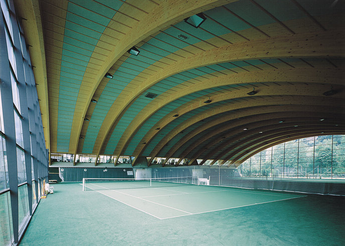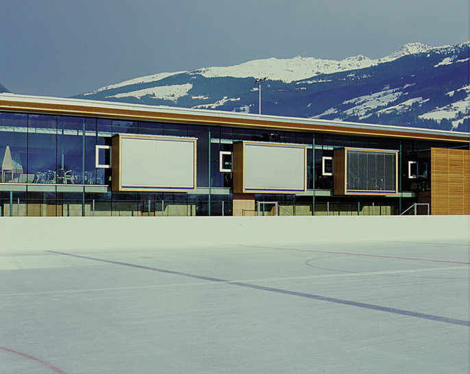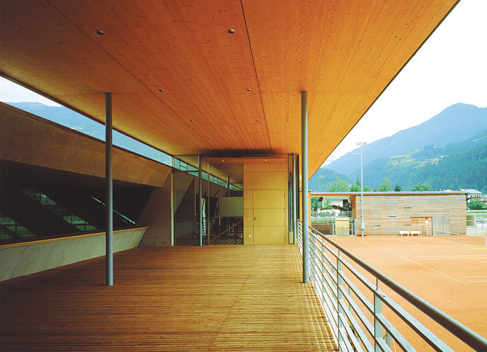 Die Halle mit verglasten, leicht schräggestellten Stirnwänden, besteht aus einer extrem schlanken Holzkonstruktion mit Spannweiten bis zu 42 Metern (2 Gelenksbogen Holzleimbinder und mittragende Schale aus 5 cm Dreischichtplatten). Das Gerüst erinnert an die langgestreckten Holzlagerstätten der Zillertaler Holzproduzenten und etwas an die klassische Freizeitarchitektur der Strandbäder.
