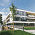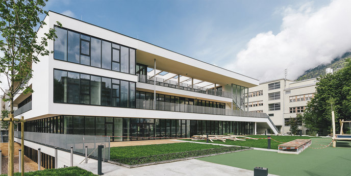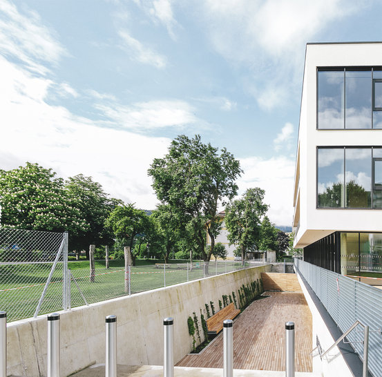 Die holzbelegten Terrassen orientieren sich nach allen Himmelsrichtungen. Nahezu jede Klasse hat einen direkten Zugang ins Freie. Eine wohldosierte Beschattung durch Pergolen, Markisen und Bepflanzung vermitteln eher Ferienstimmung.