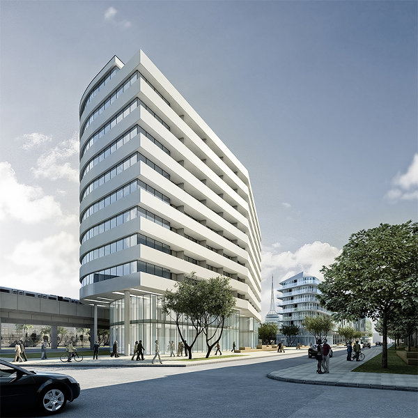 Sowohl die Form und Gestalt als auch die Situierung des Baukörpers sind Teil des Gesamtprojektes Messecarree Nord, bestehend aus drei identitätsstiftenden Baukörpern in Form eines langgezogenen Ypsilons mit angelagerten Hügeln und Freiräumen, die die angrenzenden Parks verbinden.