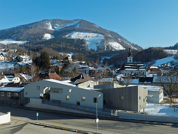 Das Grundstück für den Kindergarten liegt am Rand des historischen Ortszentrums und grenzt nördlich an eine höher gelegene Durchzugsstraße. Der Entwurf berücksichtigt die topografische Situation des Bauplatzes und seine besondere Lage im Ortsverband. Aufgrund der Grundstücksgröße ist der Kindergarten zweigeschossig angelegt. Um die für einen 5-gruppigen Kindergarten gesetzlich notwendige Spielfläche im Freien nachzuweisen, wird das räumlich strukturierte Dach als immergrüne Spielfläche ausgebildet.