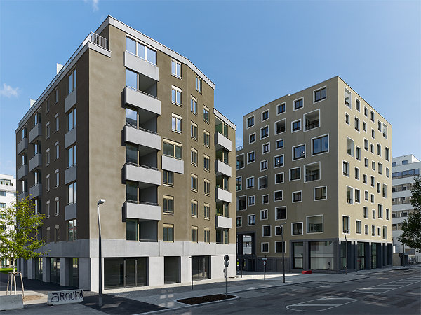 Am Areal des ehemaligen Nordbahnhofs in Wien stehen drei Häuser eng beieinander, die eine kleine Gruppe – ein räumliches Ensemble – bilden. Die drei Stadthäuser entwickeln innerhalb einer bestimmten grammatikalischen Kohärenz, eines inneren "Raumplanes", durch die einfach abgestuften blockhaften Bauformen und in der Materialisierung mit Putz und Beton eine feine Differenzierung in der Textur der Öffnungen und den architektonischen Teilformen und damit eine feine Individualisierung im Charakter sowie bezüglich der kulturellen Interpretation eines Wohnhauses.