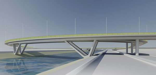 Als Tragsystem für die Brücken wurde eine Mischung aus Stahlbetonplatten und Spannbetonplattenbalken mit besonderen V-Stützen gewählt. Die Lastabtragung wird durch die Ausformung der Konstruktionsteile direkt sichtbar und durch dynamisch gestaltete Querschnitte noch überhöht. Besonders in den V-Stützen wird die Einleitung von zusätzlichen Querkräften sichtbar. Alle anderen notwendigen Bauteile wie Geländer, Beleuchtung oder Entwässerung ordnen sich der klaren Betonform unter, lediglich die Spritzschutzpaneele an den Fahrbahnquerungen werden mit neongrünen Acrylglastafeln akzentuiert, und ein Effektlicht an der Untersicht der Brücken sorgt für die Ausleuchtung der Leerräume zwischen den Tragbalken.