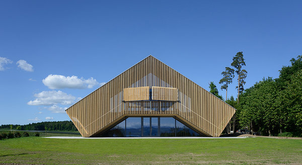 Inmitten hoch aufragender Fichten und steiler Hänge empfängt eine Waldlichtung den Wanderer und Skifahrer: Dieser Platz lädt zum Verweilen ein, denn er bietet Sonne und Aussicht. Um diese beiden Qualitäten in bester Weise zu verstärken, steht das Gebäude am oberen Rand der bestehenden Wiese, direkt unterhalb des Forstweges. Der Gastgarten öffnet sich einladend, der Baukörper deckt den Rücken der Gäste, ein verschindeltes Dach verspricht Schutz vor Wetter und Sonne, der Kamin ist von weitem das sichtbare Zeichen für Gastlichkeit.