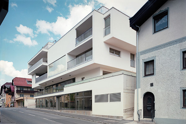 Über einer Tiefgarage, die zur Entlastung der Parksituation im Ortszentrum beitragen soll, liegen zwei offen gestaltete Ebenen, die flexibel auf die Bedürfnisse der zukünftigen Nutzer angepasst werden können. Das Erdgeschoß orientiert sich mit Schaufenstern Richtung Süden zur Meilstraße, das terrassenartig ausgestaltete erste Obergeschoß öffnet sich – dem drei Meter ansteigenden Geländeverlauf folgend – im Norden ebenerdig zum Straßenniveau. In den darüber angeordneten Wohngeschoßen teilt sich der Baukörper in einen östlichen und einen westlichen Trakt, dazwischen liegt ein lärmgeschützter Innenhof.