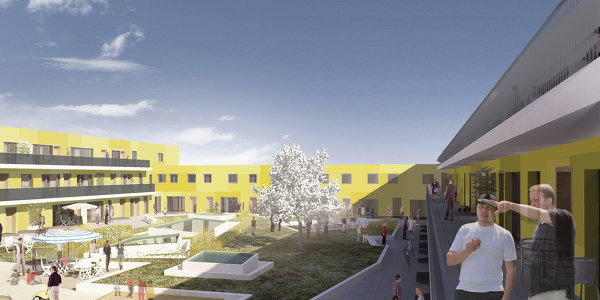 Aus diesen inneren und äußeren Rahmenbedingungen wurde ein Wohnkomplex in Form eines Vierkanthofes entwickelt, der 71 Wohneinheiten von 55 bis 100 m² um einen begrünten Innenhof gruppiert. Zweigeschoßige Maisonettewohnungen im Osten und Westen sowie ein je dreigeschoßiger Wohnbau im Norden und Süden bilden diesen Innenhof, als Herz der Anlage, mit großzügigen Gemeinschaftsflächen und Kinderspielplätzen. Sämtliche Wohnungen werden über diesen "Begegnungsraum" erschlossen.