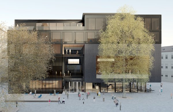 Der Platz fließt förmlich in das Gebäude hinein, und gemeinsam mit dem Landestheater entsteht ein städtebauliches Zentrum, umgeben von Hofgarten, Kongresshaus, Hofburg, Hofkirche, Volkskunstmuseum und Universität. Im Innenraum bildet sich eine mehrgeschossige Landschaft mit einer von oben natürlich belichteten Promenadentreppe an der Reibungsfläche zwischen Kammerspielen und großem Stadtsaal. In der Fassade werden geschlossene Oberflächen mit Keramikelementen ausgeführt, die verglasten Flächen bekommen geschoßhohe vertikale Keramiklamellen vorgesetzt. Es entsteht insgesamt ein homogener Charakter, der in der Differenzierung der jeweiligen Oberflächencharakteristik einen zusätzlichen Reiz einbringen wird. Mit den unterschiedlichen Tages- und Kunstlichtsituationen entsteht ein immer wechselnder, damit lebendiger und lebensnaher Eindruck.