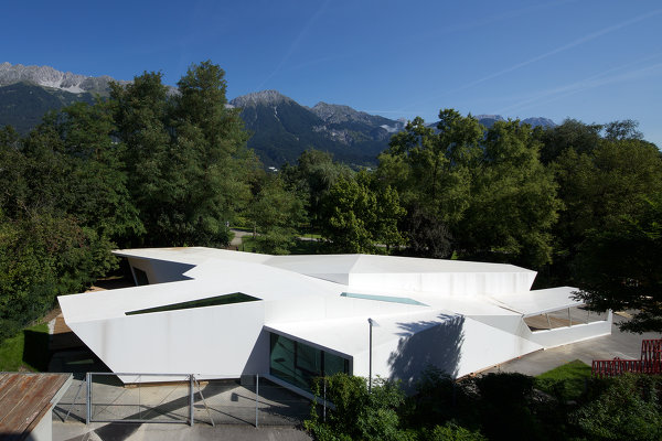 Entstanden ist ein pavillonartiges Werkstättengebäude, das nicht nur den Kindern und Jugendlichen als NutzerInnen ein optimales Raumangebot bietet, sondern auch den Park durch seine einzigartige Architektur bereichert. Vorgelagerte Terrassen und raumhohe Glasfronten verbinden den geschwungenen Baukörper mit der Umgebung; im Inneren bilden schräge Böden und Wände ein fließendes Kontinuum an Räumen mit unterschiedlichen Atmosphären und Arbeitsmöglichkeiten.