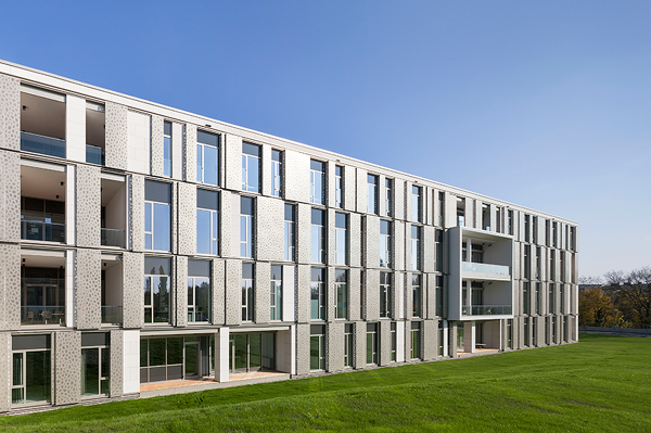 Starmann Metallbau 980 Stück geschoßhohe Schiebeläden realisiert, die aus Blechkassetten mit eigens entworfenem, gestanztem Lochbild hergestellt wurden. Das Muster selbst basiert auf der Idee, das Abbild menschlicher Zellstrukturen in einer vergrößerten mikroskopischen Aufnahme darzustellen. Insbesondere bei direkter Besonnung bietet es durch seine gesteuerte Lichtdurchlässigkeit einen sensationellen Schattenwurf im Inneren des Gebäudes, nicht unähnlich einem detailreichen Store-Vorhang. Die Technik der Lochstanzung mit verschieden großen Durchmessern und der Verwendung von Rendering-Software erzeugen für den Betrachter ein scharfes und konturenreiches Bild bei Fokussierung des Auges auf den Faltschiebeladen selbst. Bei starken Helligkeitsunterschieden wie dem Blick aus dem Gebäude in die sonnenbeschienene Umgebung oder bei nächtlicher Innenbeleuchtung und Betrachtung von außen wirkt das Lochbild wie eine abschattende Sonnenbrille, und das Auge fokussiert auf den dahinterliegenden Raum. Fehlende Bildinhalte kann das menschliche Auge mühelos ergänzen. Diese unterschiedlichen Situationen der Beleuchtung und natürlich der Stellung und Bewegung der Schiebeläden selbst ergeben ein faszinierend dynamisches und stets wandelbares Gesamtbild der Fassaden.