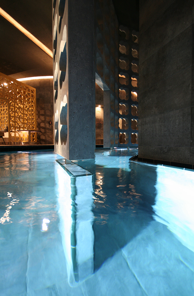 Die Beschäftigung mit der Ornamentik führte zu unterschiedlichen Herangehensweisen der Umsetzung. So wurde der zentrale Turm in HPC-Beton realisiert. Die Bar-Einhausung wurde mit CNC-gefrästen MDF-Platten bewerkstelligt, und für die Treatmenträume wurde zum ersten Mal ein neuartiges 3D-Feinsteinzeug eingesetzt. So waren wir bei diesem Projekt in allen Richtungen auf der Suche nach neuen Baulösungen. Das zentrale Thema dieser Thermenanlage ist jedoch die Wasserlandschaft und so auch die angewendeten Rinnensysteme. Agrob Buchtal konnte als einziger Schwimmbad-Keramikhersteller ein Rinnenmodell anbieten, welches den Wünschen des Architekten gemäß produziert wurde.