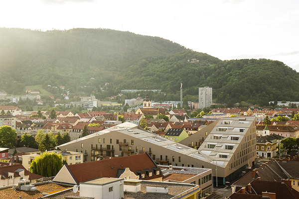 Beeinflusst durch die schwierige Nordhanglage des Grundstückes am Grazer Stadtrand und der Marktsituation entstand eine Siedlung aus unterschiedlichen Bautypen, die jedoch durch eine gemeinsame "Sprache" in der Ausformulierung der Gebäude und durch ein stringentes Farbkonzept zusammengehalten wird.