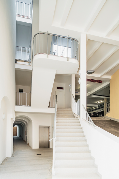 Der Altstadtkern von Ried i.I. ist wie der vieler Städte in der Region von einer schleichenden Absiedelung betroffen. Als Baumeisterin Birgit Mayr das aus dem 16. Jahrhundert stammende Gebäude 2009 erwirbt, belichten drei winzige Lichthöfe das viergeschoßige Volumen so mangelhaft, dass bis auf das Geschäft im Erdgeschoß das Gebäude völlig leer steht. Ursprünglich handelte es sich beim Stadthaus Nimeth um zwei Parzellen mit einem Vorderhaus zum Hauptplatz, großem Innenhof und einem Hinterhaus zur Kirchengasse, die über ein Durchhaus verbunden waren. Dem Bestreben der Bauherrin, einen attraktiven Wohnort zu gestalten, folgt ein entschiedener Abbau der verdichteten Struktur und die Rückgewinnung einer großzügigen Hofanlage mit Revitalisierung der Altbauteile. 12 Wohnungen mit Loggien, Terrassen oder privaten Gärten sind nun über Laubengänge, zwei Stiegen und Lift von der Passage aus zugänglich. Mit vorgefertigten Stahlbetonrippendecken gelang es, die Auflast auf die bestehende Fundierung zu minimieren und dem Gebäude ein gemeinsames gestalterisches Element zu geben. Ungewöhnlich, aber angesichts der Versäumnisse um die Parkraumschaffung durch die Stadtverwaltung unvermeidbar, war der Einbau der Garage im ersten Stock mit Auffahrt von der Kirchengasse.