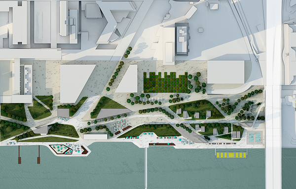 Die Idee einer Dockingstation, an die alle gesellschaftlichen Schichten Anschluss haben, wird architektonisch im Sinne einer funktionalen Infrastruktur interpretiert. Die Definition spezifischer Flächen durch unterschiedliche Widmungen für permanente bzw. temporäre Nutzungen bildet eine strukturierte Oberfläche, auf der sich Objekte oder Gebäude mit unterschiedlichen Anforderungen verorten können. Die Erweiterung des hochmodernen Wohn- und Bürokomplexes hin zum Wasser sowie die barrierefreie Verschränkung konsumfreier Zonen und niedrigschwelliger Service-Einrichtungen etabliert eine Plattform für die Durchdringung unterschiedlicher Lebensrealitäten.