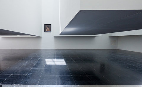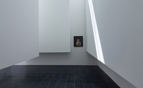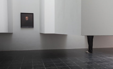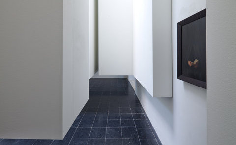Anders als bei den räumlichen Skulpturen von Bruce Nauman oder Robert Morris ist hier aber der räumliche Eingriff nicht autonom, sondern zugleich eine Art Bühnensystem oder Environment zum Display verschiedener Arbeiten. Es ist ein Versuch, einerseits unterschiedliche Elemente zu etablieren, durch kontrastierende Platzierungen aber gleichzeitig eindeutige Zuschreibungen zu nehmen. So hängen in den beiden vorderen Räumen vor allem manipulierte Portraits des ausgehenden 19. bzw angehenden 20. Jahrhunderts, die durch ihre Bearbeitung ihrem historischen Kontext entzogen sind und durch die Anordnung in dem engen Parcours eine weitere Entfremdung erfahren.