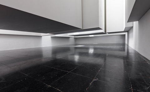 Die Installation im inneren Bereich des Pavillons besteht aus verschiedenen schmalen Korridoren, die labyrinthartig durch die Räume leiten. Der Besucher wird quasi durch den Pavillon choreographiert. Der Raum wird dabei nicht bloß in vertikale Achsen zerlegt, sondern erfährt vor allem in der Horizontalen eine markante Trennung. Der menschliche Körper ist der zentrale Bezugspunkt der Gliederung: Die Körpermitte, also ungefähr die Nabelhöhe, ist der Punkt, an dem sich der räumliche Eingriff polarisiert. Im Gegensatz zum klassischen Labyrinth, in dem das Leitsystem am Boden beginnt und irgendwo über Augenhöhe endet, ist hier der Ankerpunkt an der Decke. Die Wände beginnen oben und enden hier nicht unten.